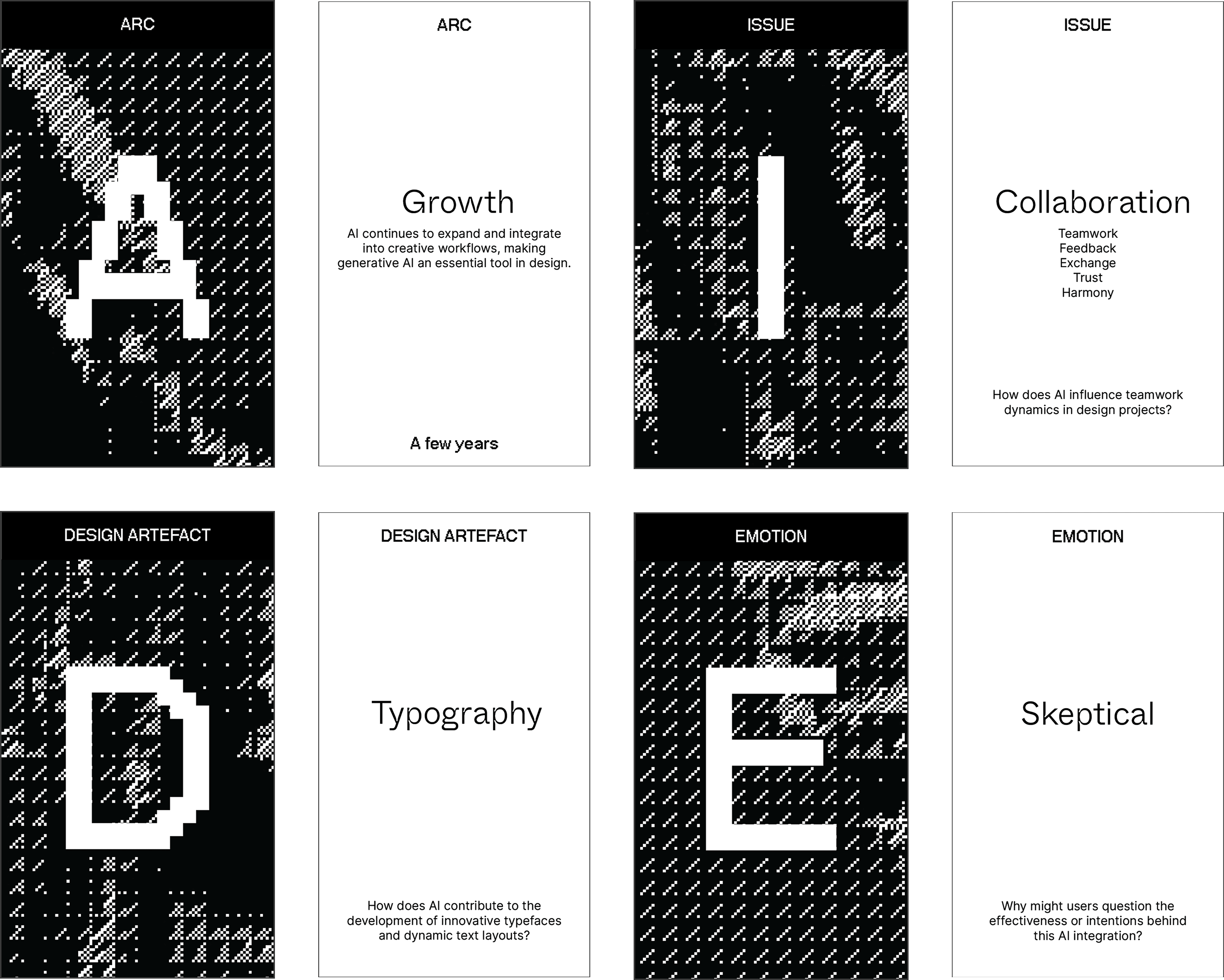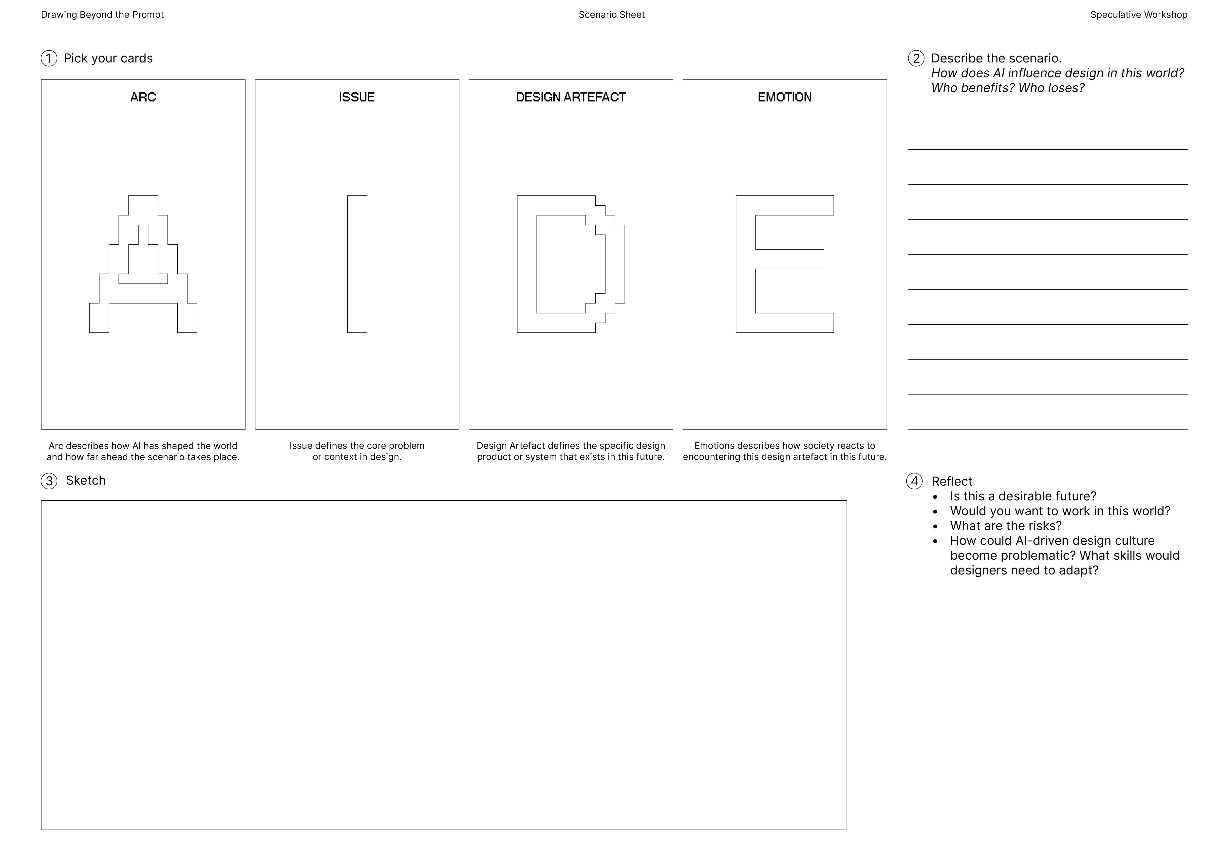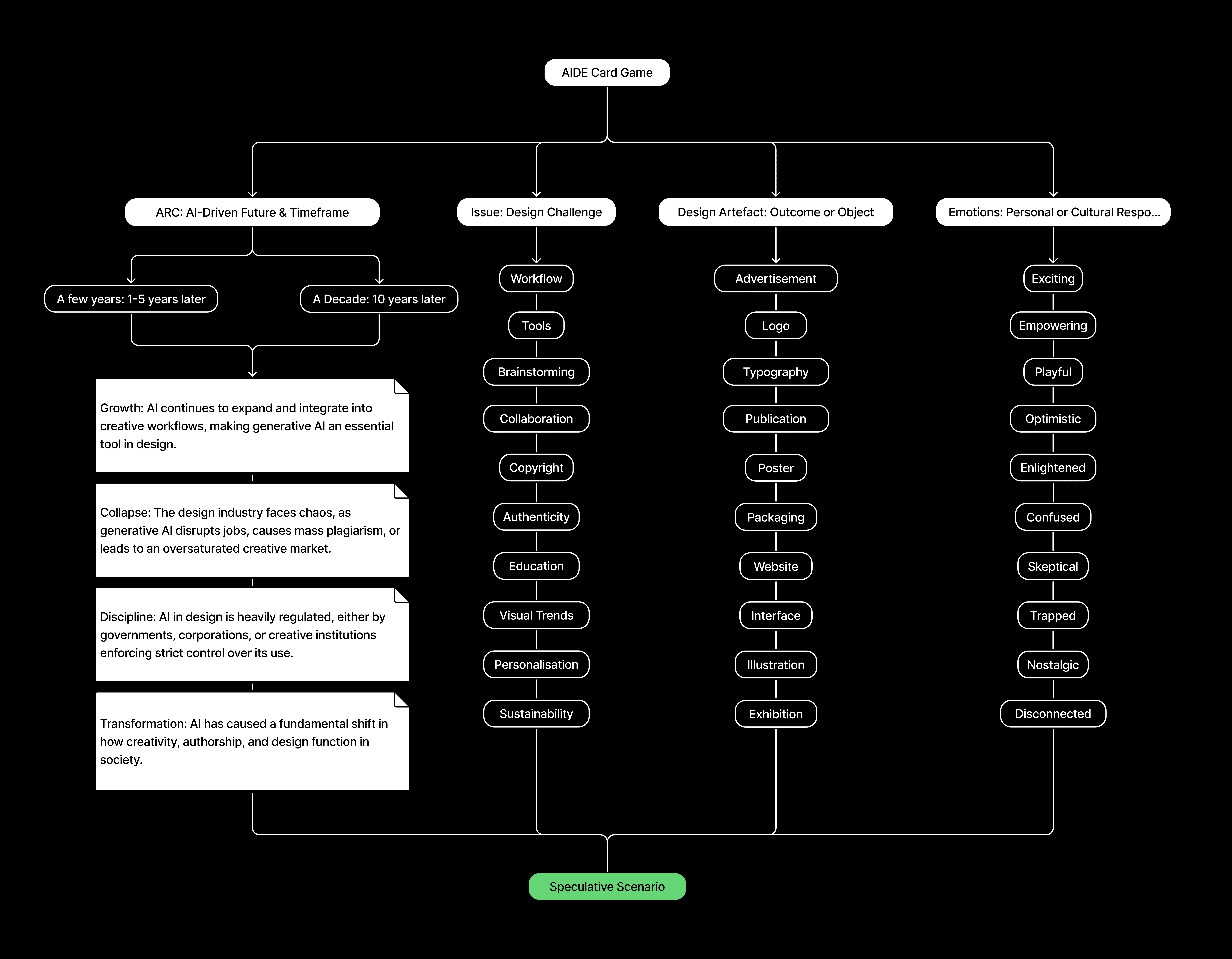The AIDE Card Game (Arc, Issue, Design Artefact, Emotion) is a speculative design tool created to help designers think critically and creatively about the future of AI in design. It is used in workshops to generate imaginative scenarios that explore how AI might shape creative workflows, authorship, and ethics.
