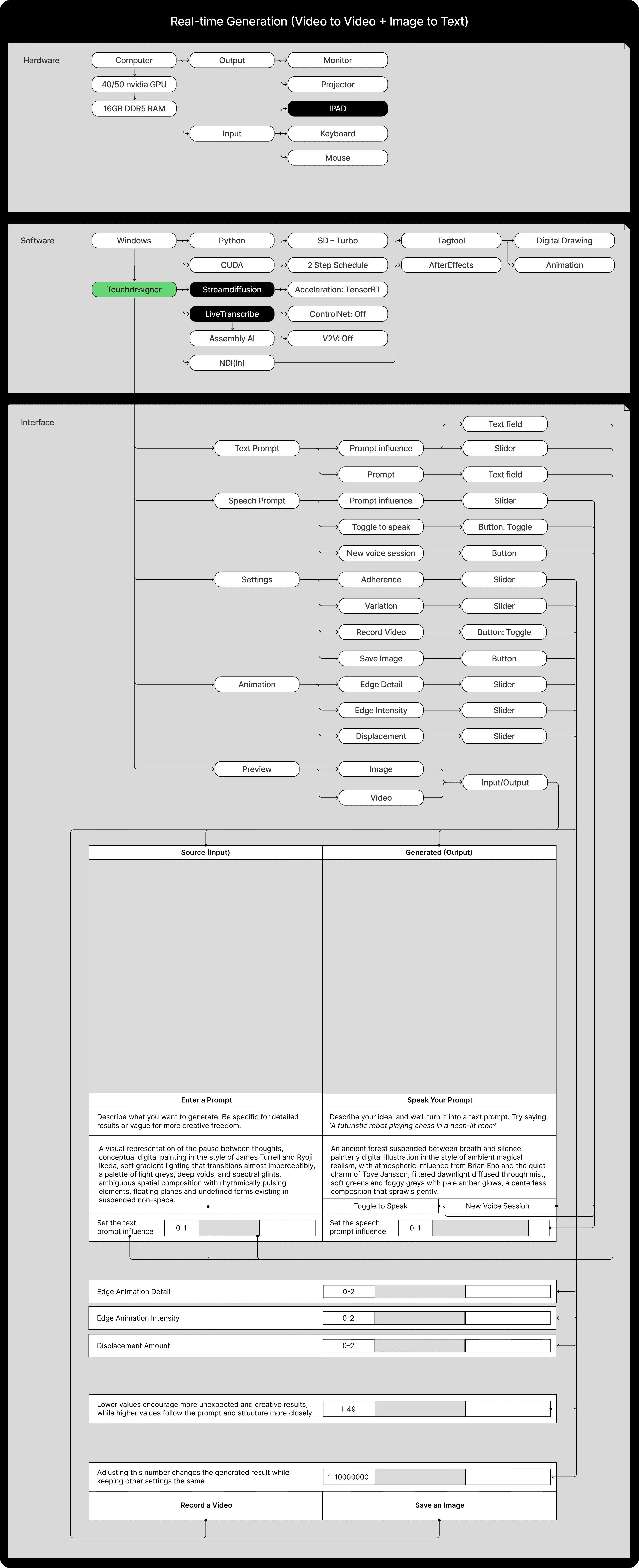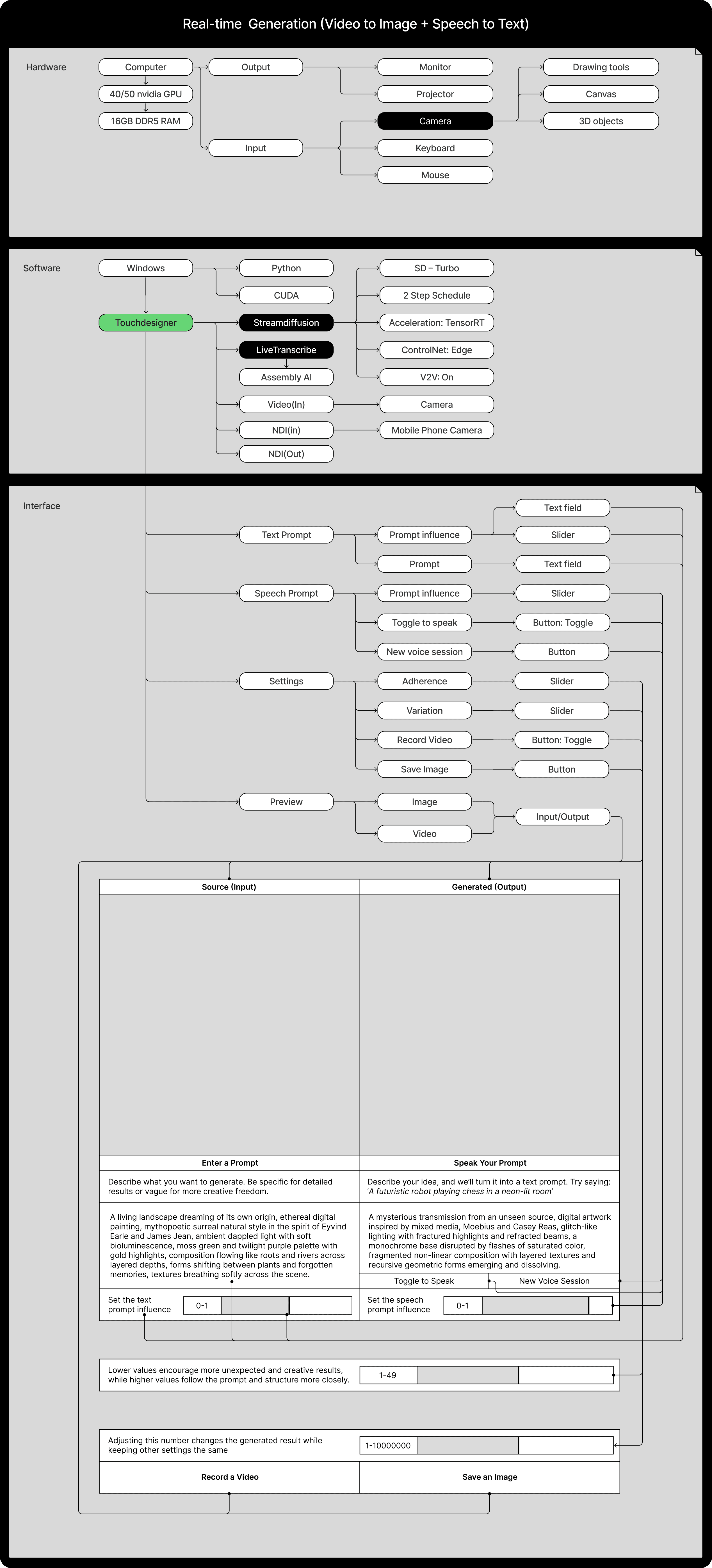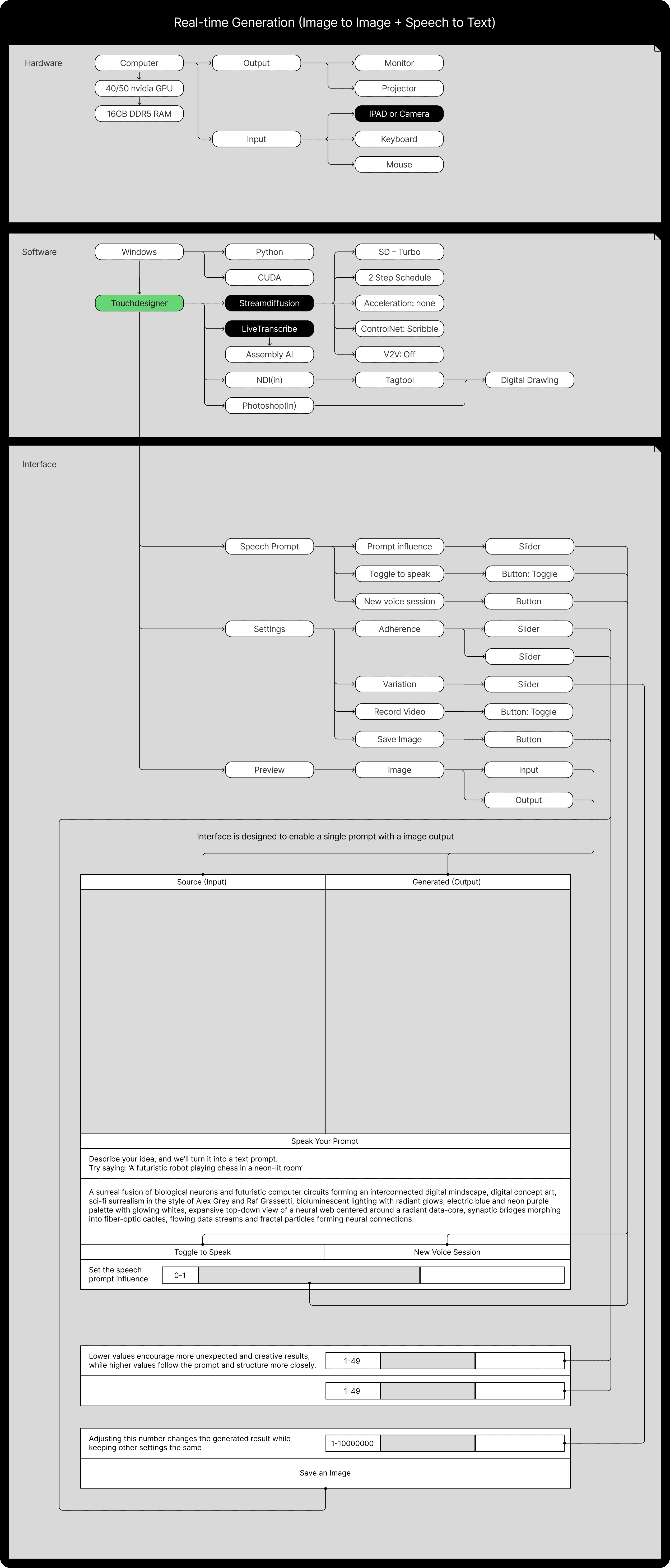 The Drawing and Speech Prototype is a set of speculative artefacts designed to explore how multimodal interaction—combining drawing and speech—affects creative workflows in AI-assisted design. Developed as provocations, these prototypes were introduced during the workshop to create friction and prompt critical reflection before participants crafted speculative scenarios. The three prototypes—WhisperDraw, Coform, and AniGen—each investigate different ways users engage with hand-drawn input while using speech to guide or manipulate AI-generated outcomes.